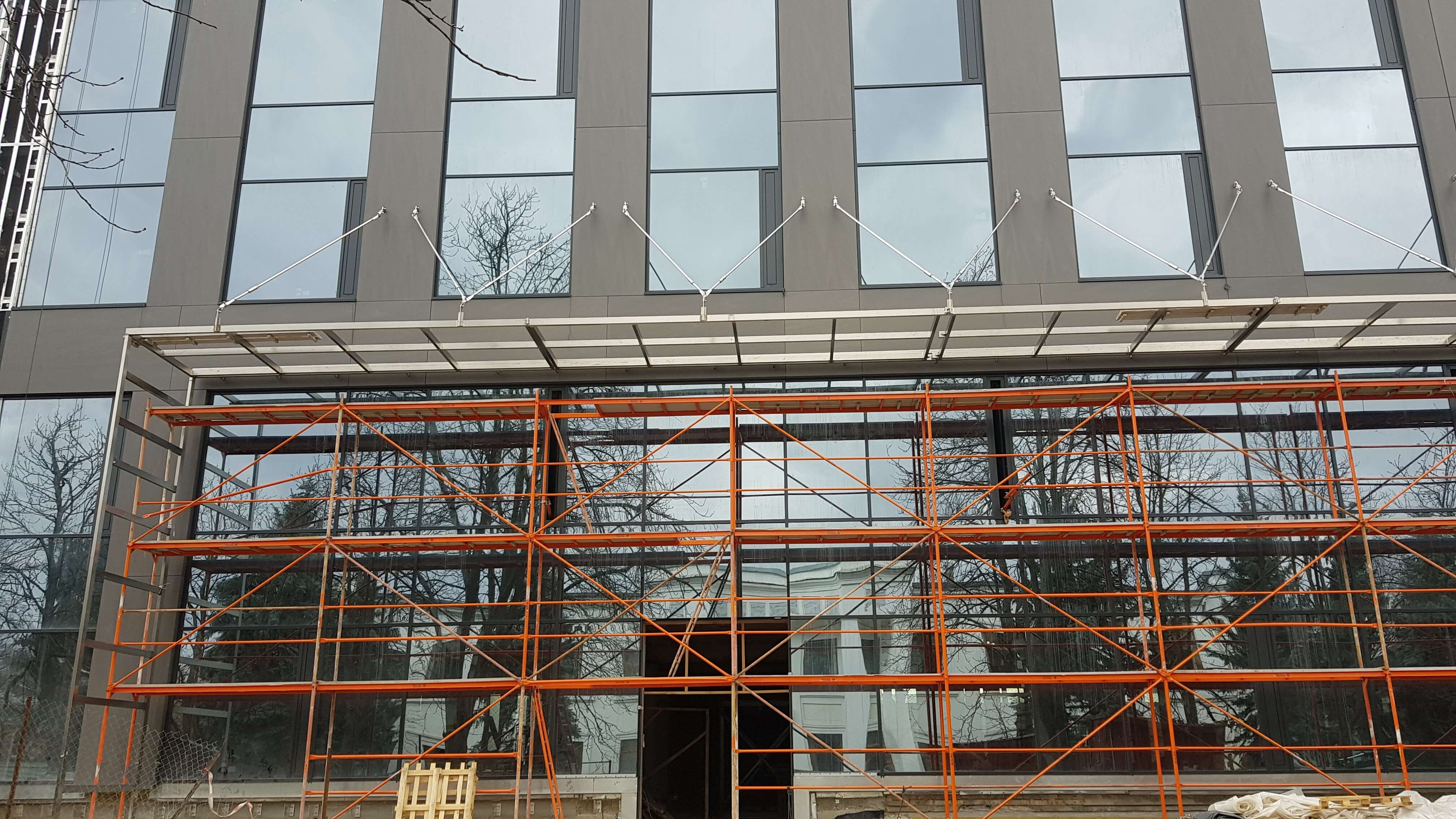 Через вентильований фасад монтаж потребував спеціальних закладних деталей — сталевих пластин і анкерів, закріплених до несучої стіни. Всі точки кріплення були розраховані з урахуванням ваги скла та вітрових навантажень, а для надійності застосовано хімічні анкери. Великі конструкції підтримують кронштейни та розтяжки, що забезпечують стабільність без пошкодження фасадного облицювання.